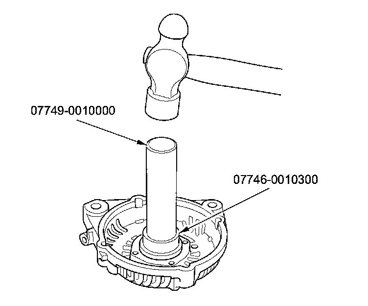 16. Install a new front bearing in the drive-end housing with a hammer, the driver handle, 15 x 135L, and the attachment, 42 x 47 mm.
