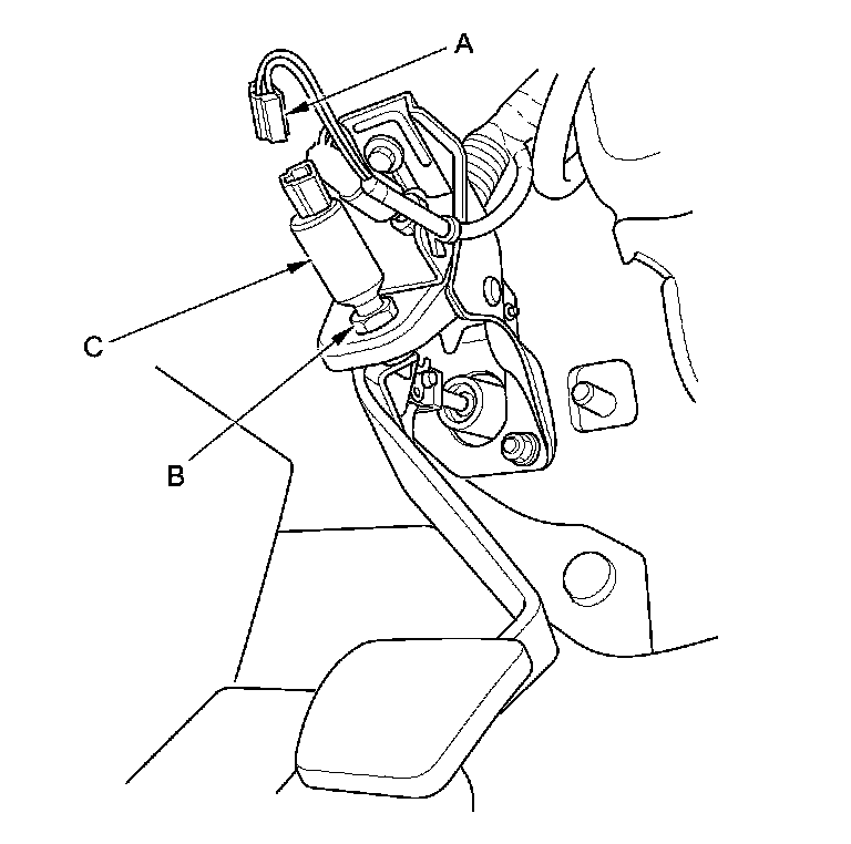 2. Loosen the locknut (B), then remove the clutch pedal position switch (C).