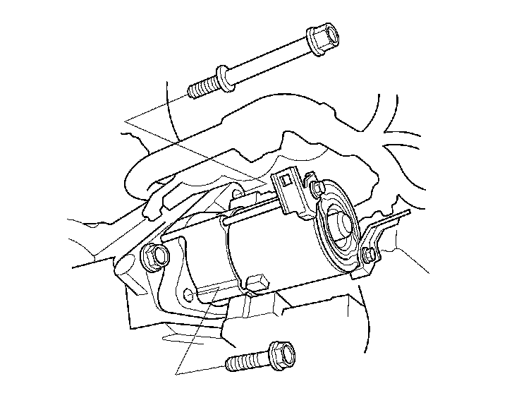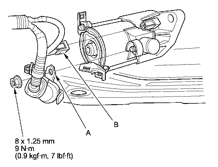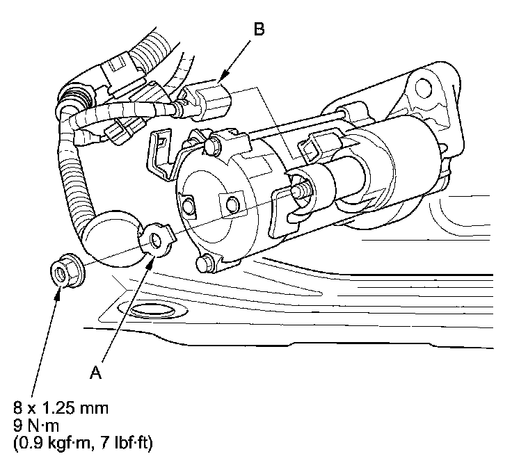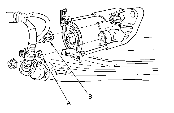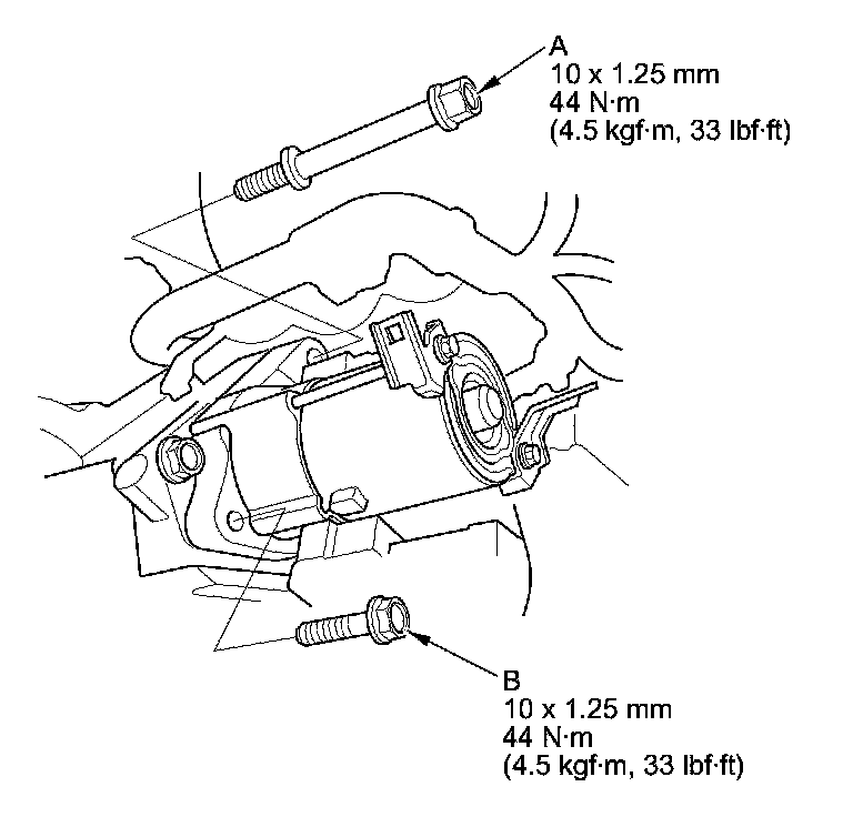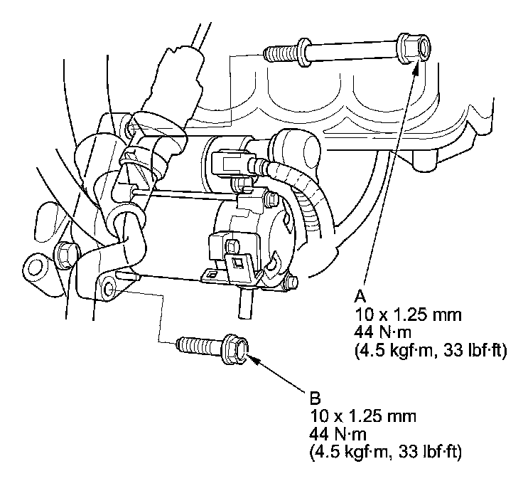 2. Install the starter, then loosely install the upper mounting bolt (A) and the lower mounting bolt (B).