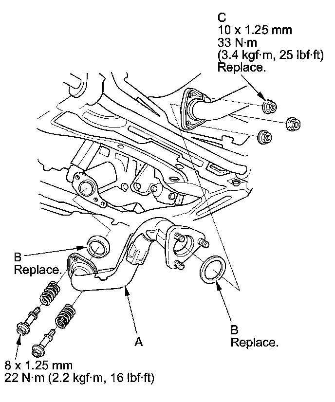 6. Install exhaust pipe A. Use new gaskets (B) and new self-locking nuts (C).
