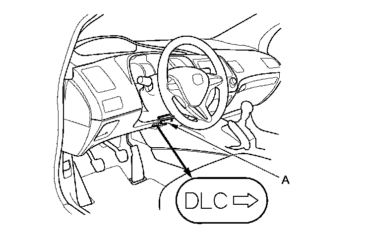 1. With the ignition switch in LOCK (0), connect the HDS to the data link connector (DLC) (A) located under the driver's side of the dashboard.
