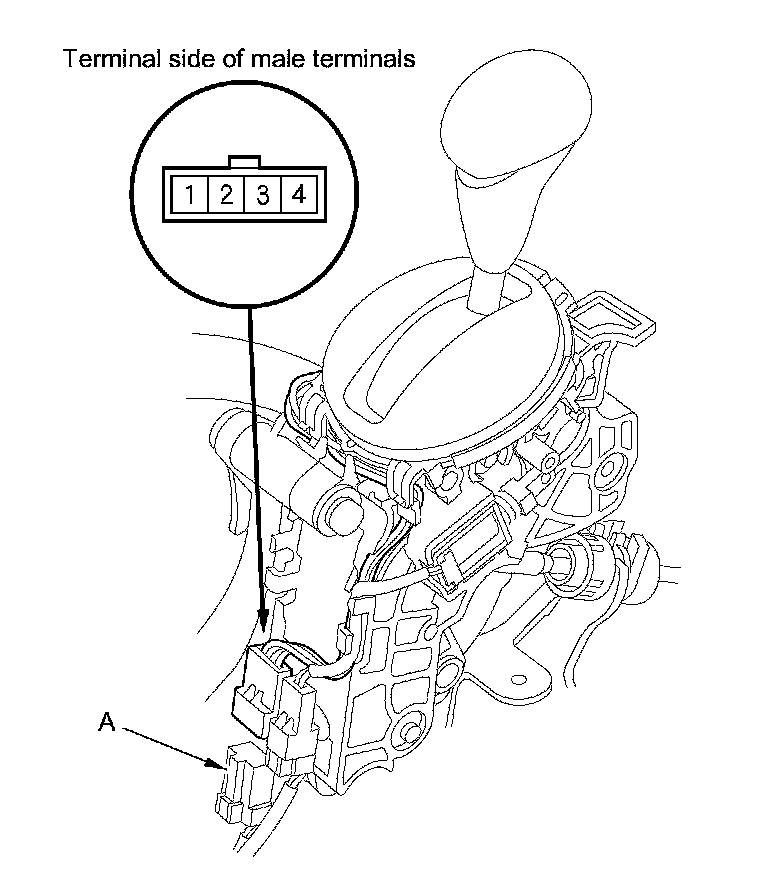 2. Disconnect the A/T gear position indicator panel light/park pin switch 4P connector (A).