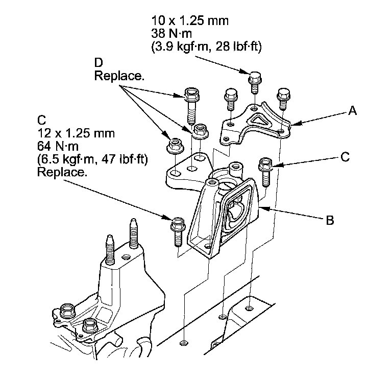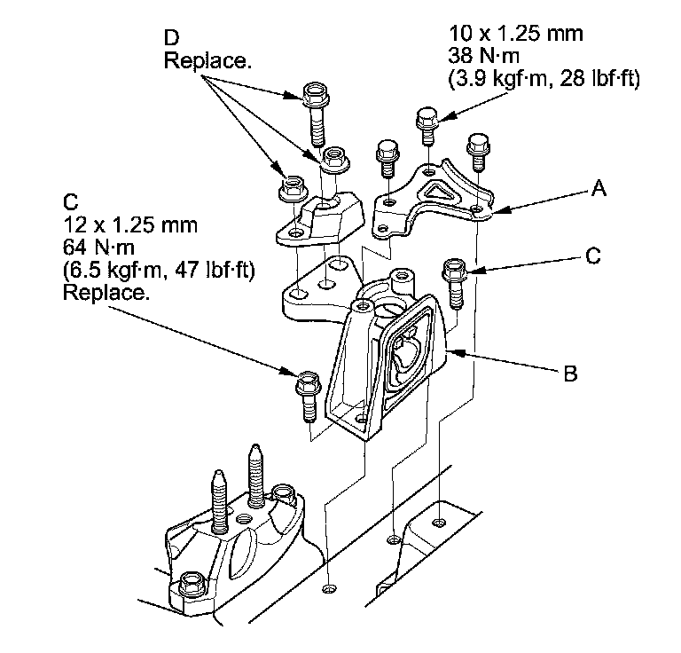 11. Install the transmission mount, and tighten the new transmission mount mounting bolts (C), then install the transmission mount stiffener.