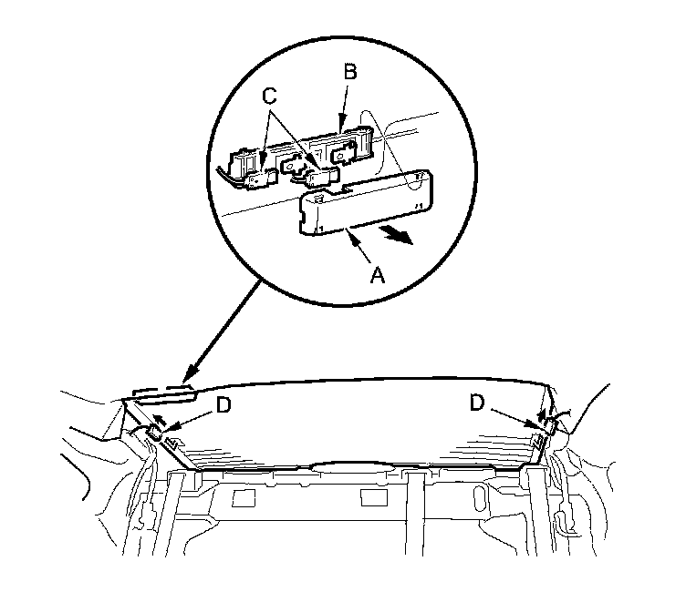 2. Remove the window antenna terminal cover (A) from the window antenna terminal cover base (B), and disconnect the window antenna terminals (C).