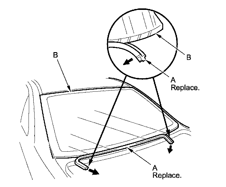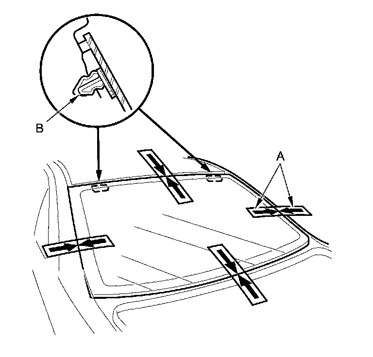 7. Remove the lower rubber dam (A) from the lower edge of the rear window (B). If necessary, cut the molding with a utility knife.