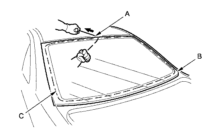 8. With a helper on the outside, pull the piano wire (A) back and forth in a sawing motion. Hold the piano wire as close to the rear window (B) as possible to prevent damage to the body, and carefully cut through the adhesive (C) around the entire rear window.