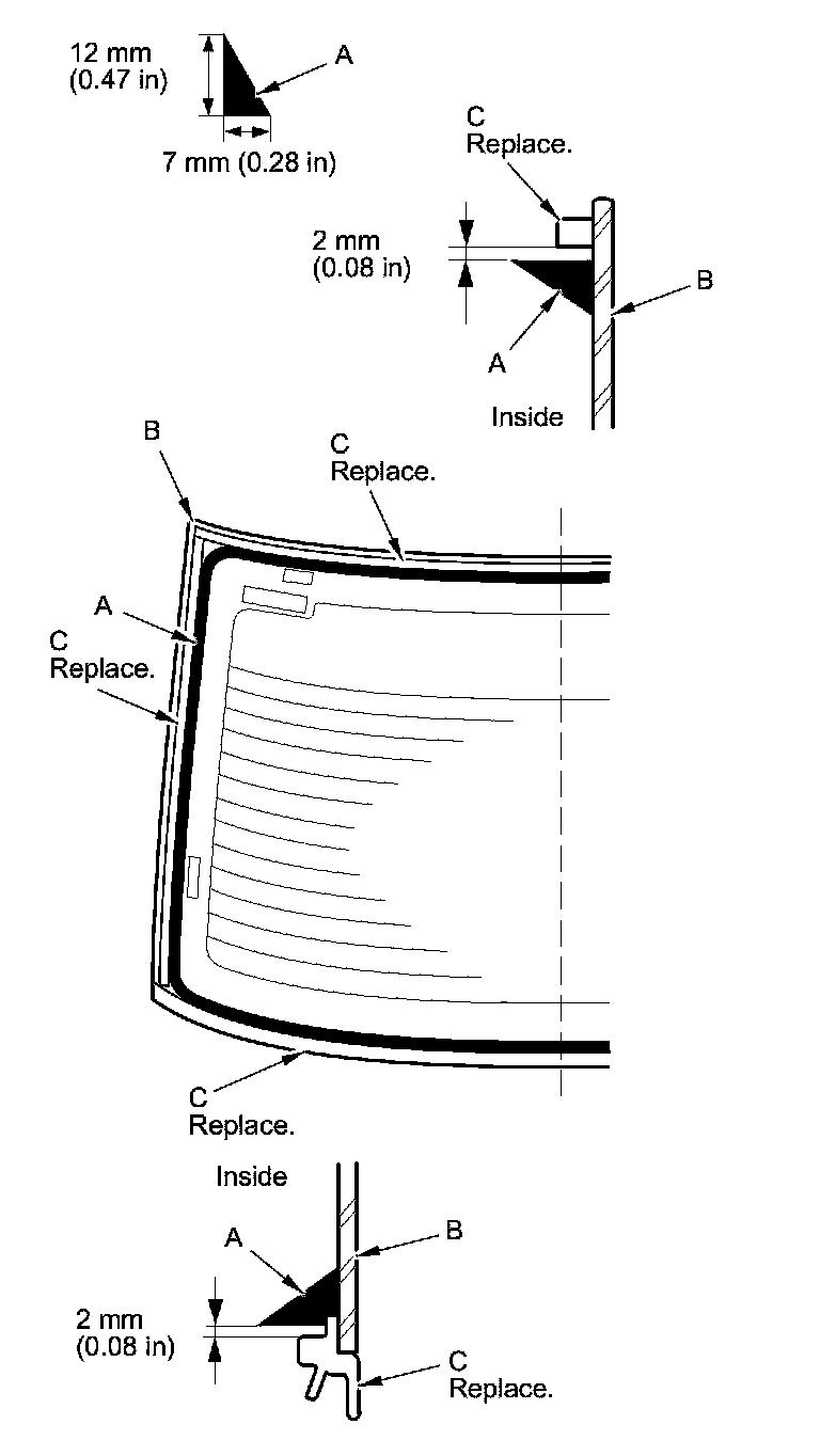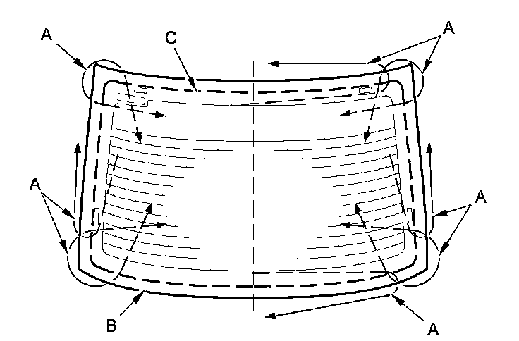 14. Apply glass primer to the edge of the rear window (A) where the new lower rubber dam (B) will be attached as shown. Attach the lower rubber dam with adhesive tape (C) to the lower edge of the rear window: