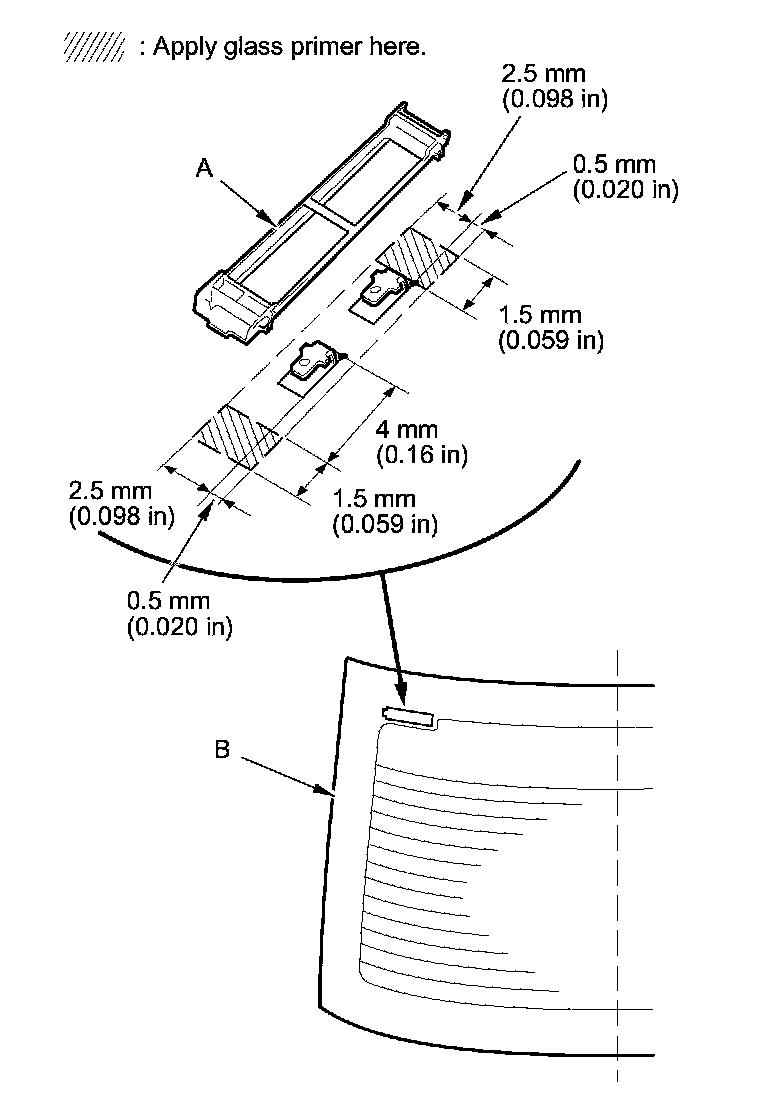 13. Attach the window antenna terminal cover base (A) with adhesive tape to the inside face of the rear window (B) as shown. Apply glass primer to the inside face of the rear window as shown.