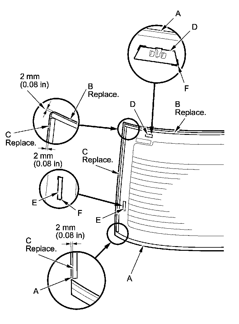 15. Apply glass primer to the upper clip mounting areas on the rear window (A), and let it dry. Attach the upper rubber dam (B), the side rubber dams (C), the clips (D), and the fasteners (E) with the adhesive tape to the inside face of the rear window as shown: