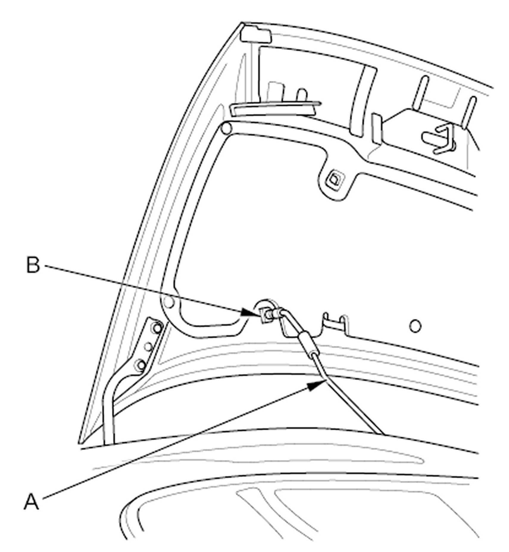 1. Open the hood, and secure it with hood support rod (A) in the wide open position (B).