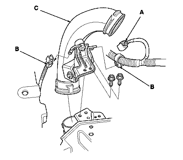 7. Disconnect the connector (A), and remove the harness clamps (B), then remove the pipe (C).