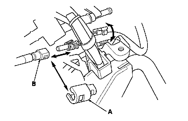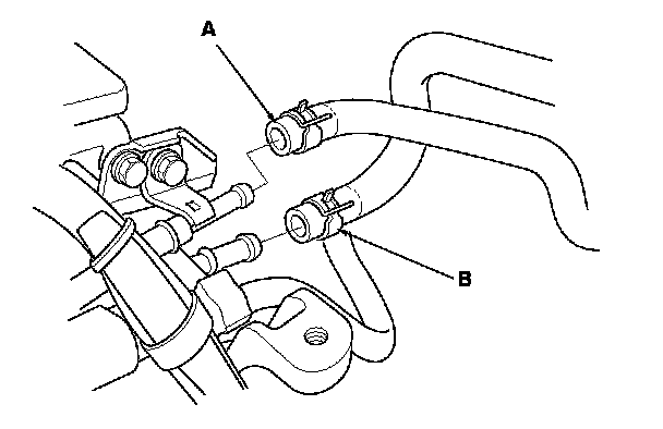 14. Disconnect the evaporative emission (EVAP) canister hose (A) and the brake booster vacuum hose (B).
