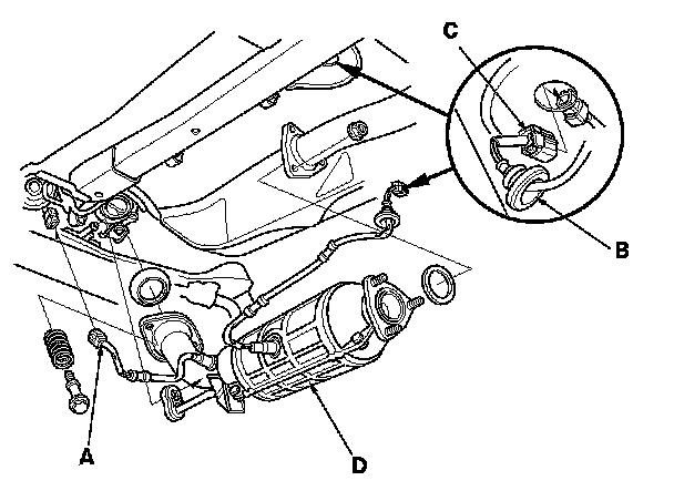 29. Remove the grommet (B), then disconnect the secondary heated oxygen sensor (secondary HO2S) connector (C).
