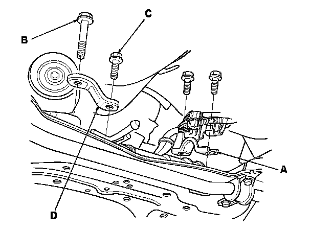 35. Remove the steering gearbox mounting bolt (B), the stiffener mounting bolt (C), and the stiffener (D).