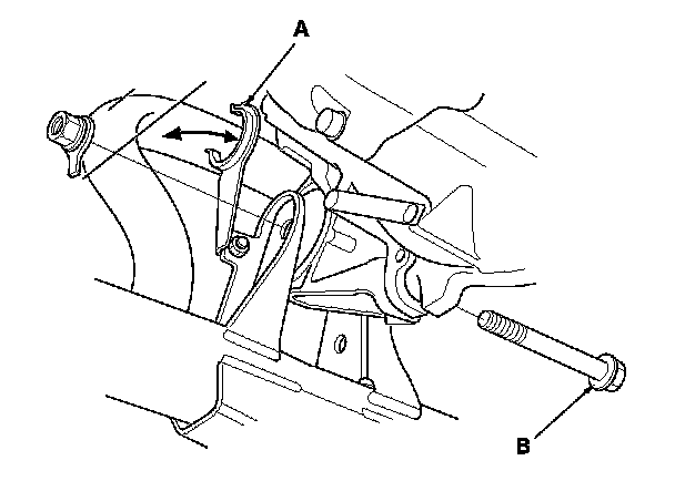 47. Remove the lower radiator hose from the clamp (A), then remove the front mount mounting bolt (B).