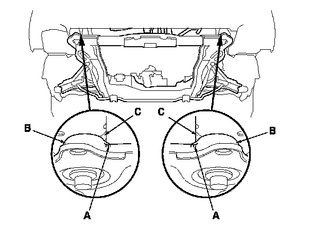 48. Make appropriate reference lines (A) at both sides of the front subframe (B) that line up with the edges (C) on the body.