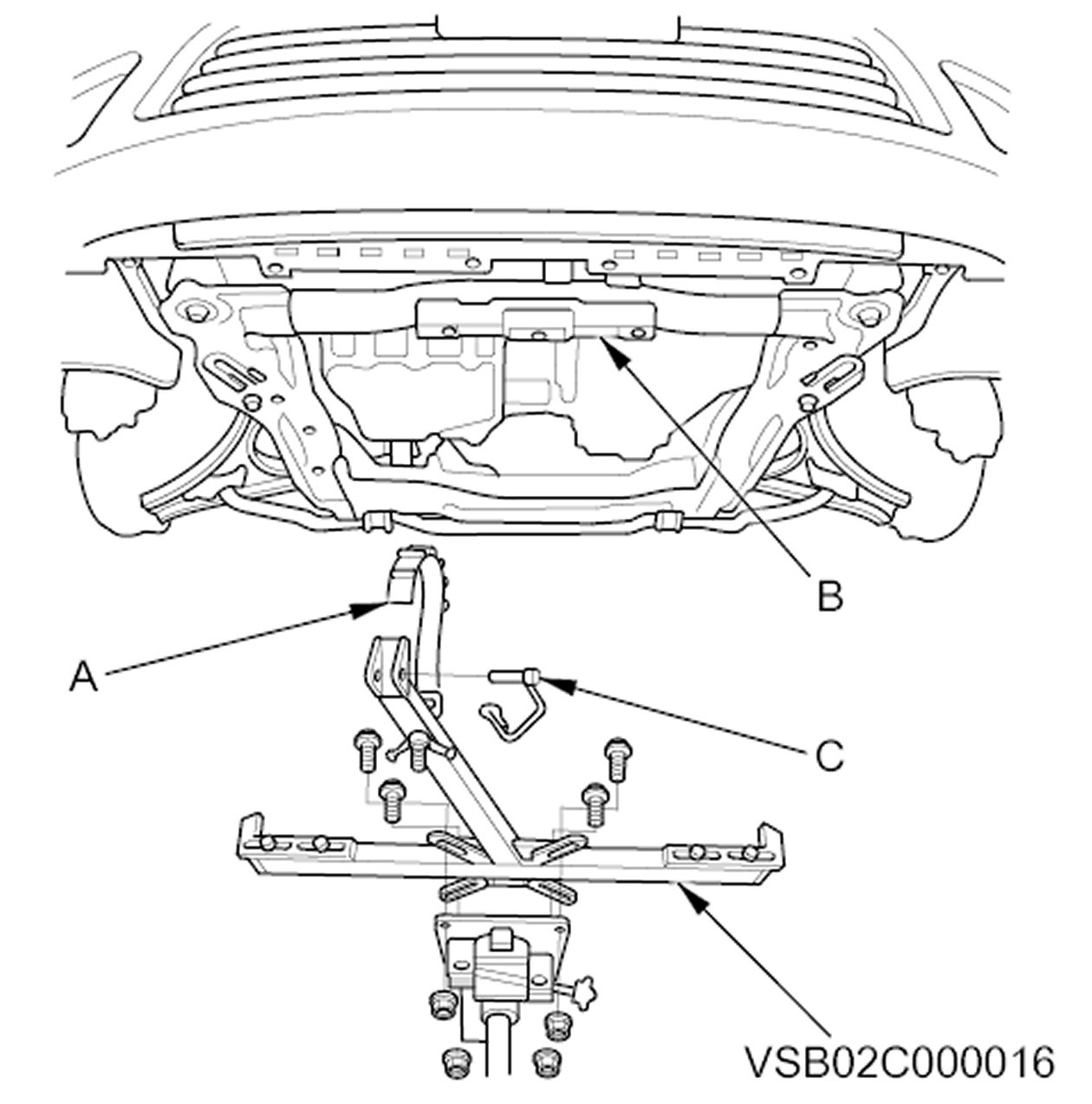 50. Attach the subframe adapter (VSB02C000016) to the front subframe by looping the belt (A) over the front of the front subframe (B), then secure the belt with its stop (C).