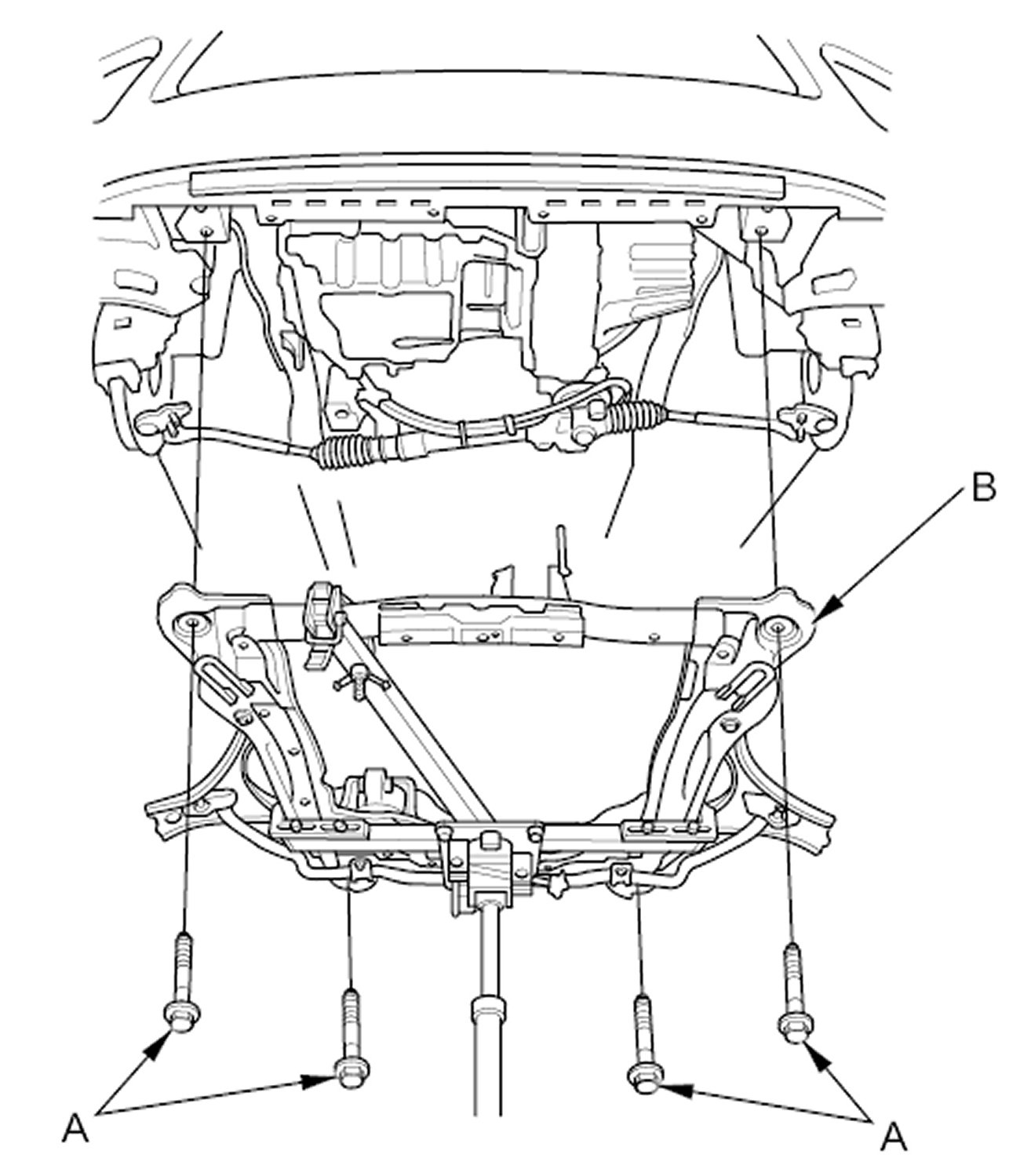 53. Remove the front subframe mounting bolts (A), then the lower subrame (B).