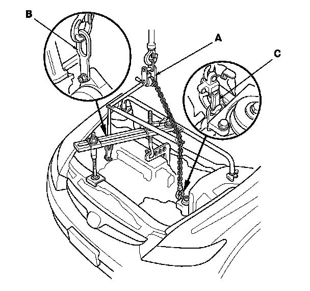 56. Attach a chain hoist (A) to the universal lifting eyelet (B) and the transmission hook (C), then lift the engine/transmission until it's securely supported by the chain hoist, and remove the engine hanger.