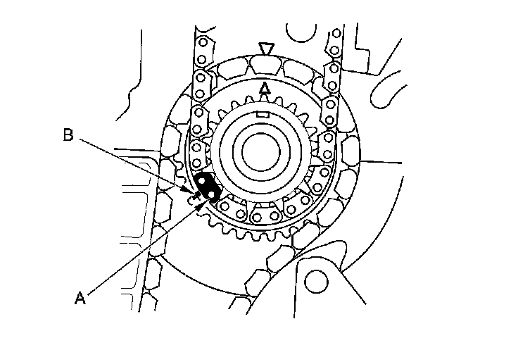 5. Install the cam chain on the crankshaft sprocket with the colored link plate (A) aligned with the mark (B) on the crankshaft sprocket.