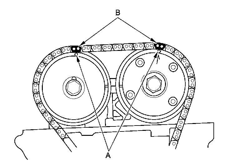 6. Install the cam chain on the VTC actuator and the exhaust camshaft sprocket with the punch marks (A) aligned with two colored link plates (B).