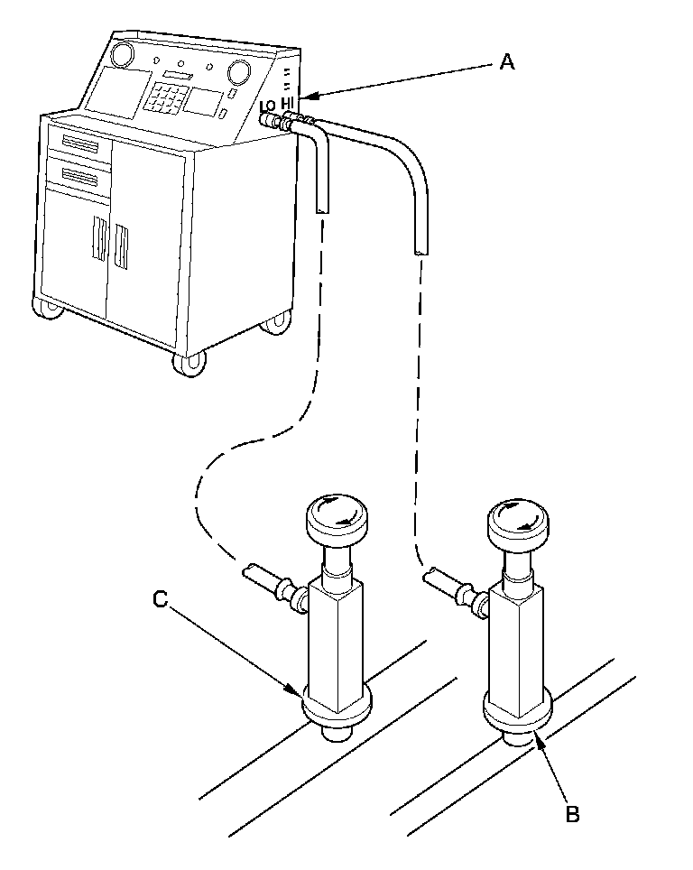 1. Connect an R-134a refrigerant recovery/recycling/charging station (A) to the high-pressure service port (B) and the low-pressure service port (C), as shown, following the equipment manufacturer's instructions.