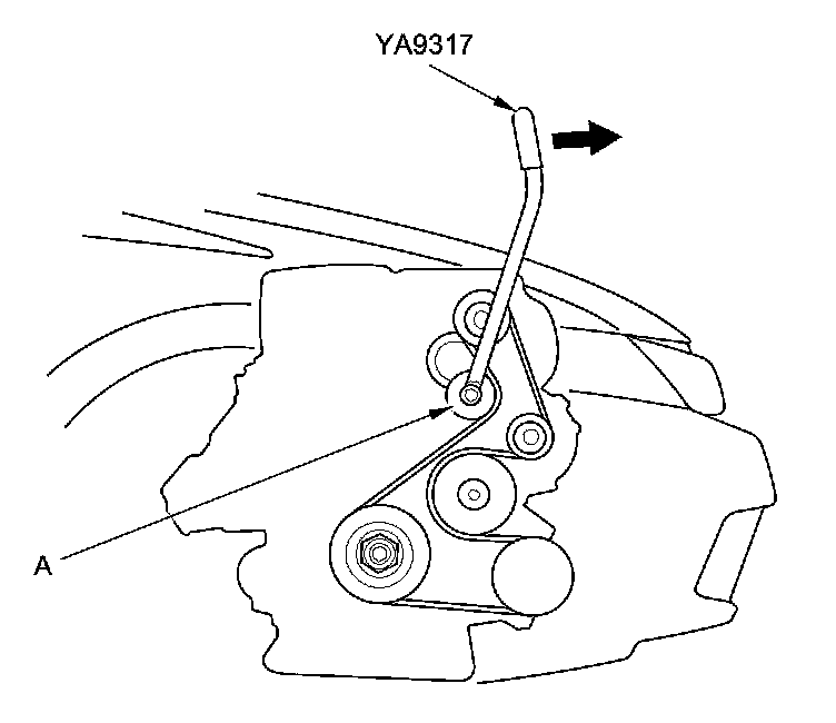 1. Move the auto-tensioner (A) using the belt tension release tool in the direction of the arrow to relieve tension from the drive belt, then remove the drive belt.