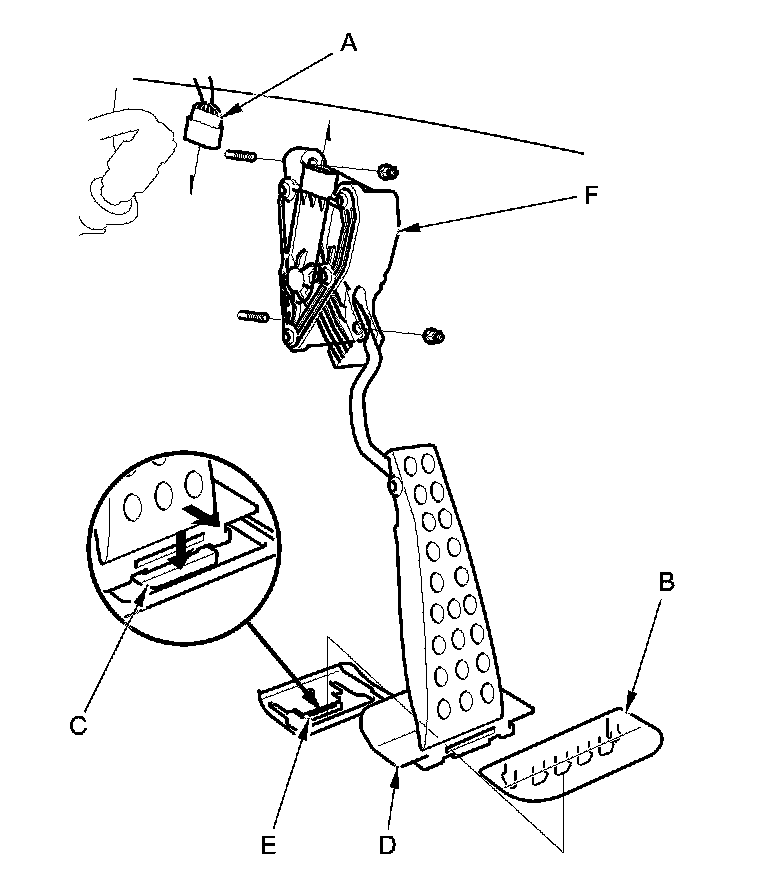 3. Push the tab (C), and remove the accelerator pedal pad (D) from the pedal stop (E).