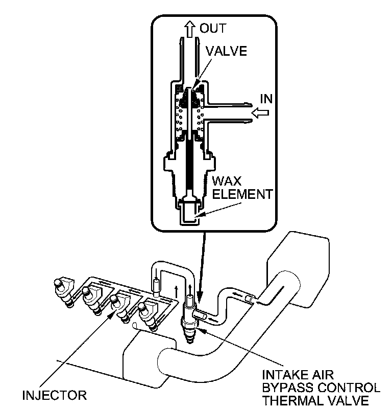 The amount of air is regulated by engine coolant temperature. Once the engine is hot, the intake air bypass control thermal valve closes, stopping air to the injector.