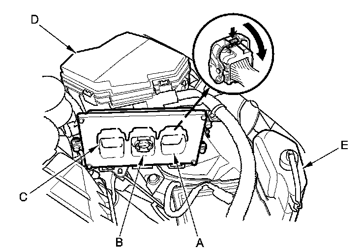 10. Remove the bolts (D), then remove the ECM (E).