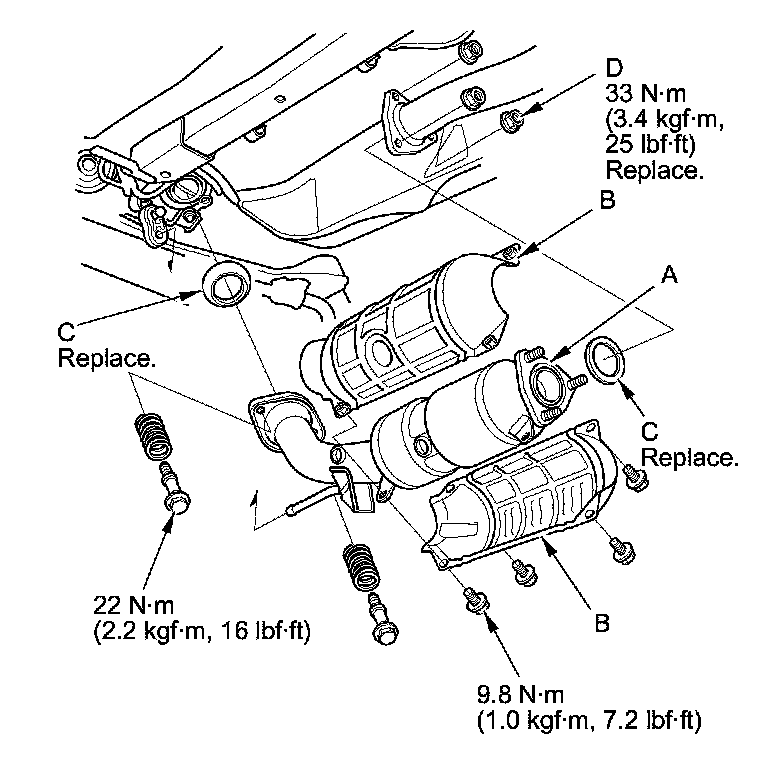 5. Install the parts in the reverse order of removal with new gaskets (C) and new self-locking nuts (D).