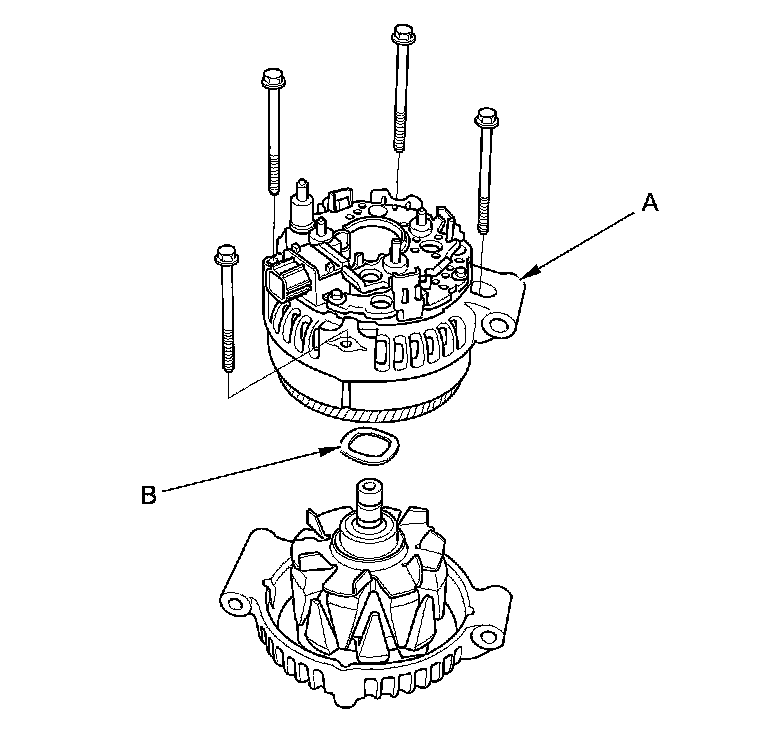 7. Remove the four through bolts, then remove the rear housing assembly (A) and the washer (B).