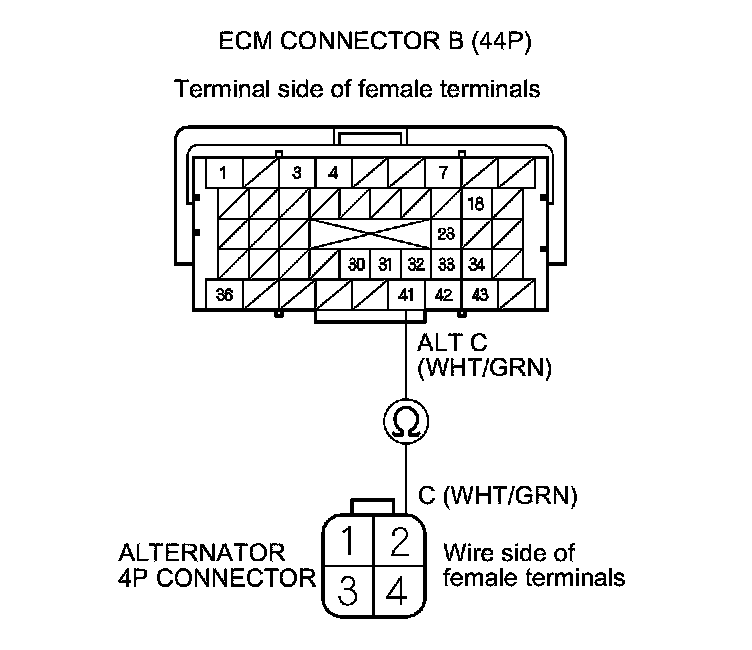 13. Check for loose terminal and connectors, then check for continuity between ECM connector terminal B41 and alternator 4P connector terminal No. 2.