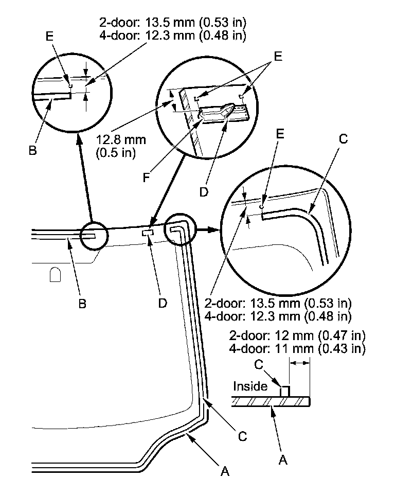 11. Apply glass primer to the upper clip mounting areas on the windshield (A), and let it dry. Remove the adhesive backing and attach the upper rubber dam (B), the side rubber dam (C), and the upper clips (D) with adhesive tape to the inside face of the windshield as shown: