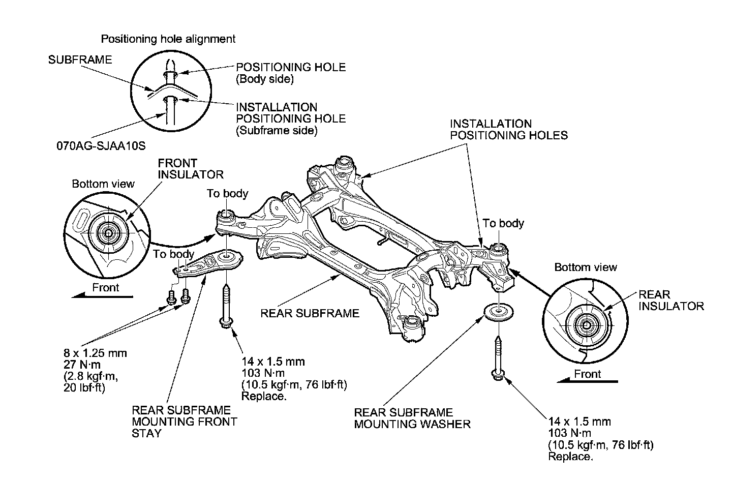 5. Tighten the subframe mounting bolts to the specified torque values starting with the right rear subframe mounting bolt. Use the subframe alignment pin when tightening the rear side subframe mounting bolts.