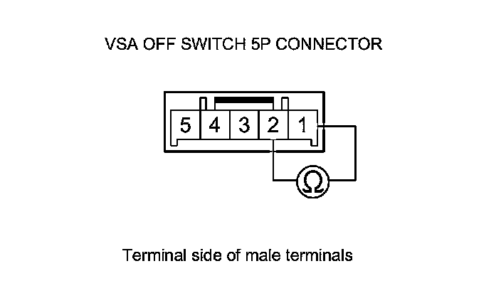 5. On the switch side, check for continuity between VSA OFF switch 5P connector terminals No. 1 and No. 2. There should be continuity at all times.