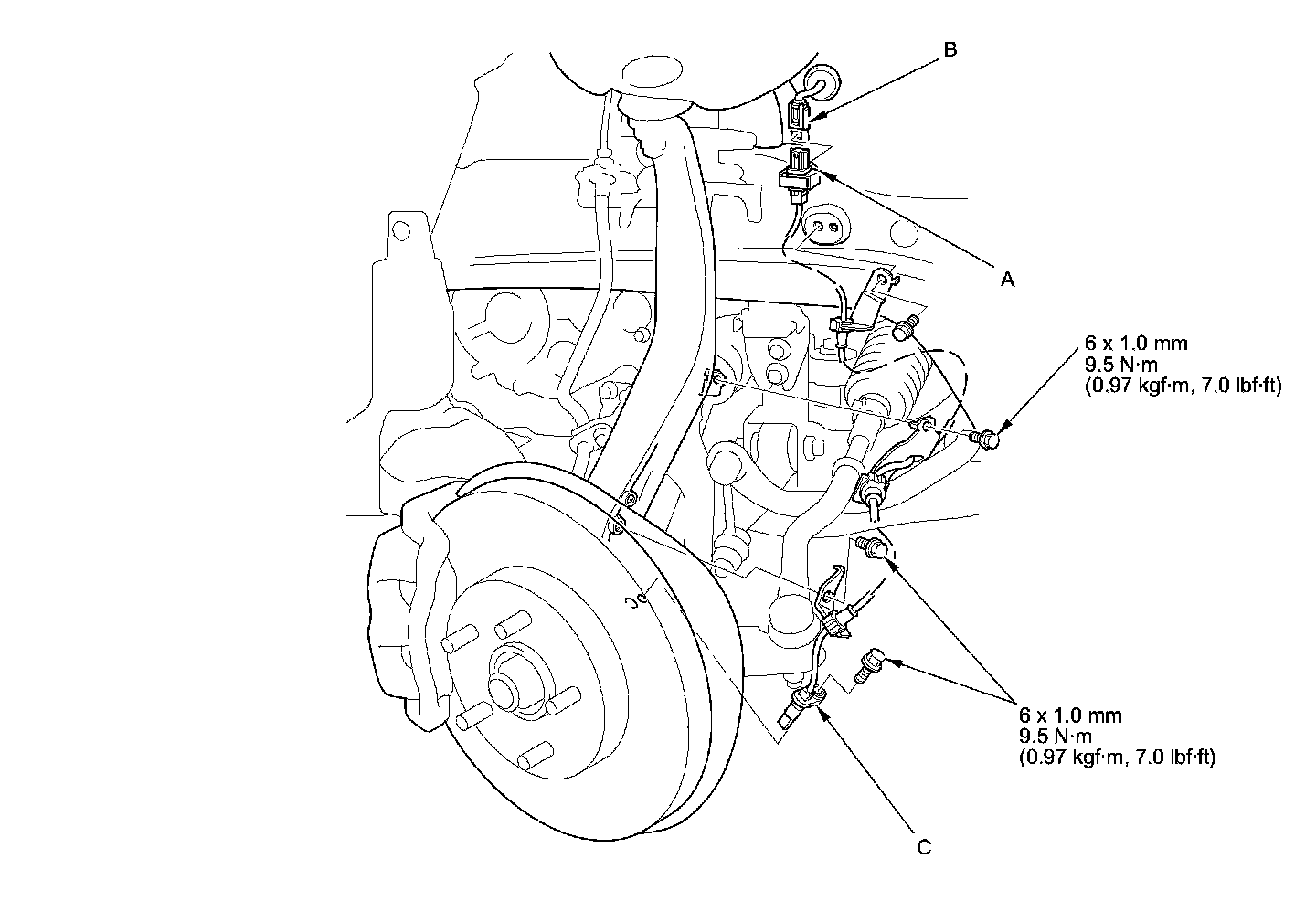 3. Remove the clamps, the bolt, and the wheel speed sensor (C).