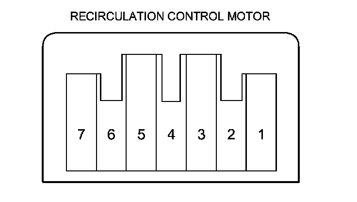 2. Connect battery power to terminal No. 7 of the recirculation control motor, and ground terminal No. 6; the recirculation control motor should run, and stop at Fresh. If it does not, reverse the connections; the recirculation control motor should run, and stop at Recirculate. When the recirculation control motor stops running, disconnect battery power immediately.
