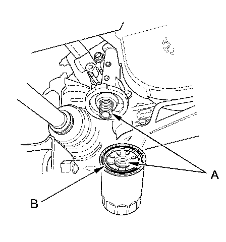 3. Inspect the threads (A) and the rubber seal (B) on the new filter. Clean the seat on the oil filter base, then apply a light coat of new engine oil to the oil filter rubber seal. Use only filters with a built-in bypass system.