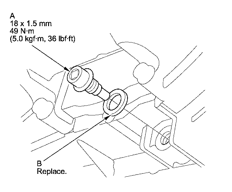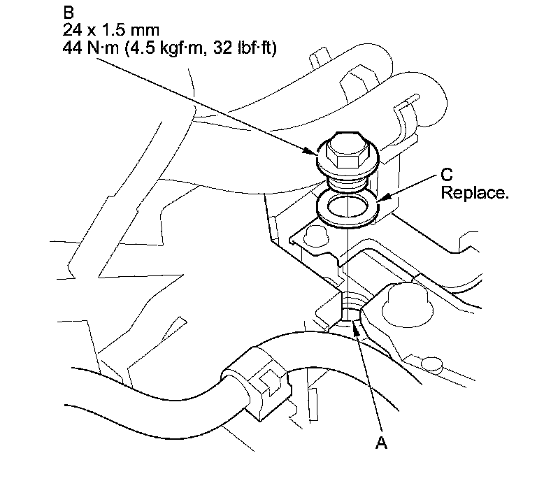 7. Install the ATF filler bolt (B) with a new sealing washer (C).