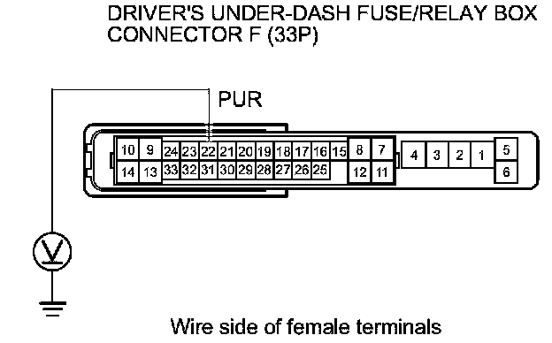 8. Measure the voltage between driver's under-dash fuse/relay box connector F (33P) terminal No. 22 and body ground.