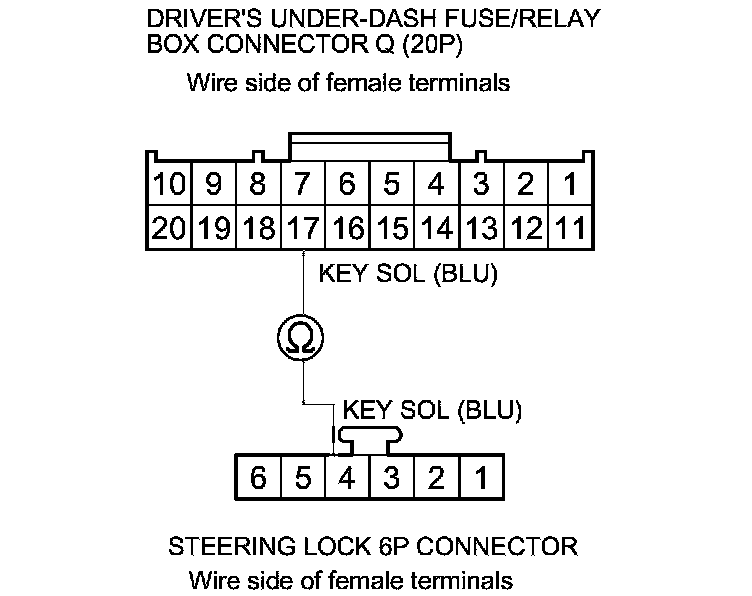 12. Check for continuity between driver's under-dash fuse/relay box connector Q (20P) terminal No. 17 and steering lock 6P connector terminal No. 4.