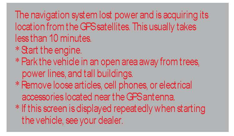 4. The instructions below appear on the screen to indicate that the system is initializing (determining its location from the GPS satellites). Follow the on-screen instructions.