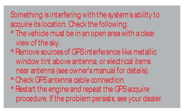 ^ The GPS antenna receives location information from orbiting satellites. Anything that blocks or interferes with the signal affects accuracy. The GPS signal can be blocked or interfered with (vehicle position shown incorrectly on the map) by: