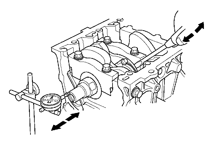 5. Push the crankshaft firmly away from the dial indicator by prying, and zero the dial against the end of the crankshaft. Then pull the crankshaft firmly back toward the indicator by prying; the dial reading should not exceed the service limit.