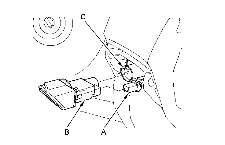 2. Disconnect the connector (A), and remove the humidity/in-car temperature sensor (B) from the aspirator hose (C).