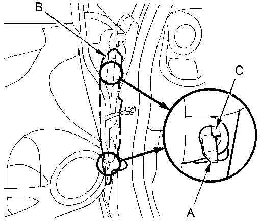 - Before installing the clips, make sure the hooks (A) of the front fender fairing (B) are installed into the holes (C) in the front fender securely.