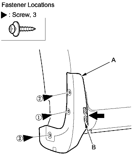 - Canada model without side sill panel: Fasten the front splash guard mounting screws in the sequence shown. Push the splash guard (A) against the body to make the adhesive (B) stick securely.