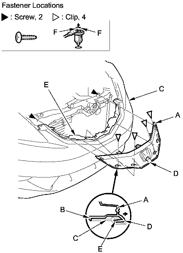 NOTE: To release the clips, pry up on the center pin at the notch (F).