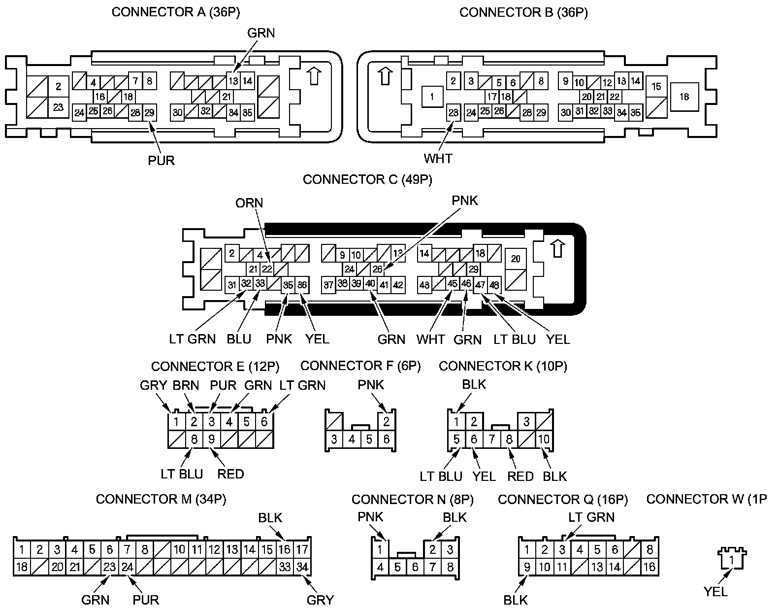 3. Disconnect under-dash fuse/relay box connectors A, B, C, E, F, K, M, N, Q, and W.